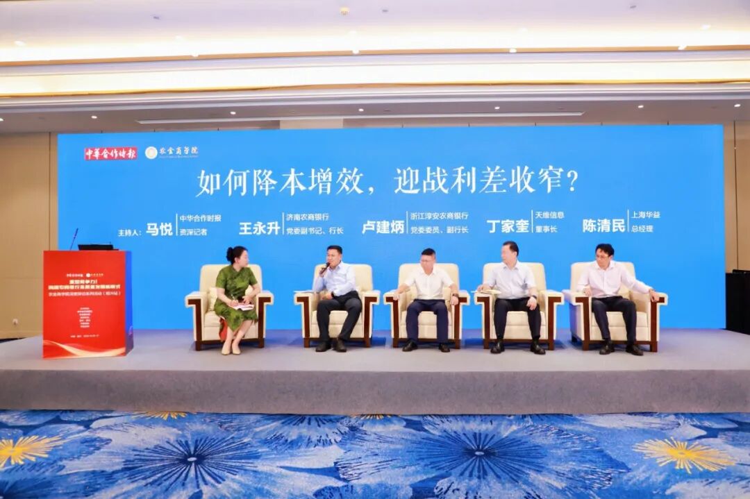 在圆桌论坛环节,济南农商银行党委副书记、行长王永升,浙江淳安农商银行党委委员、副行长卢建炳,广州天维信息技术股份有限公司董事长丁家奎,上海华益企业管理咨询有限公司总经理陈清民一同针对“如何降本增效,迎战利差收窄?”这一主题展开深入探讨和交流,为农商银行应对利差压力提供新的视角与策略。