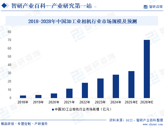 3D工业相机作为工业自动化与智能化升级的关键设备,凭借其强大的数据处理和分析能力,显著提升了测量精度与效率,在智能制造、机器人导航、物流分拣等前沿领域的应用需求持续井喷,已然成为推动工业4.0进程的核心技术之一。近年来,中国3D工业相机市场规模呈现出迅猛的增长态势,据GGII数据显示,2024年市场规模已达28.15亿元,同比增长19.20%。尽管当前市场增速有所放缓,但3D视觉技术的确定性发展趋势已然形成,随着各行业对高精度、高效率检测需求的不断释放,以及技术的持续迭代升级,GGII预计2025年3D工业相机市场将继续保持增长势头,到2028年市场规模有望突破70亿元,2024-2028年复合增长率预计约达25%,未来发展前景广阔,将为工业领域的智能化转型注入强大动力。