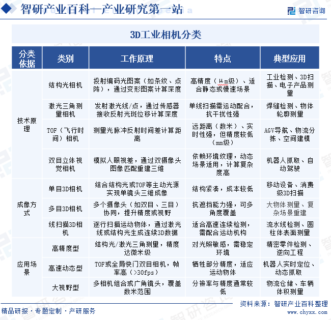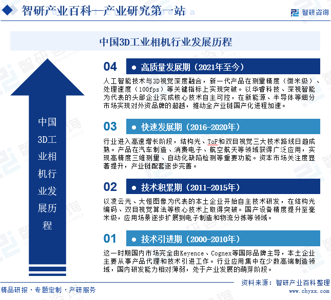 中国3D工业相机行业经历了从技术引进到自主创新的跨越式发展历程。21世纪初,国际品牌主导市场,国内以技术引进和代理为主。2010年后,以凌云光等为代表的本土企业开始技术积累,在结构光、双目视觉等领域取得突破。2016—2020年期间,结构光、ToF和双目视觉等技术路线逐渐成熟,3D工业相机在汽车制造、电子装配、航空航天等高端制造领域得到广泛应用,用于高精度尺寸测量、缺陷检测和逆向工程等。2021年以来,人工智能与3D视觉技术深度融合,3D工业相机具备更强的数据处理和分析能力,测量精度与效率进一步提升,头部企业实现核心技术自主可控,在部分细分市场超越国际品牌,完成从“跟跑”到“并跑”乃至“领跑”的转变,目前正加速推进全产业链国产化替代进程。