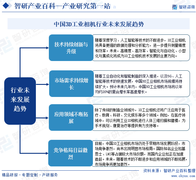 中国3D工业相机行业未来将呈现多重积极发展趋势。技术层面,深度感知、结构光、双目视觉等先进技术将更广泛应用,推动产品向更高精度、智能化与自动化方向升级;市场层面,受益于智能制造、数字化转型及自动化需求激增,市场规模将持续扩大,且国产化进程加速,国产品牌主导地位将进一步巩固;竞争层面,行业虽仍处于早期发展阶段、竞争激烈,但随着技术突破与市场需求增长,未来将形成更稳定的竞争格局,头部企业将凭借技术优势和品牌影响力占据更大市场份额,同时企业也将通过多元化发展提升竞争力。