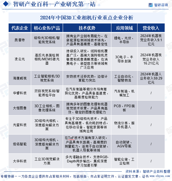 凌云光技术股份有限公司作为中国3D工业相机领域的代表企业,在机器视觉与光通信两大核心业务板块深耕细作,秉持“为机器植入眼睛和大脑”的创新理念,不断强化视觉成像技术优势。凭借二十余年的深厚技术积累与产业链布局,公司持续加大自研相机研发投入,已实现线阵相机产品的广泛覆盖,在表面检测行业自研供应率超50%,展现出强大的技术自主性与市场竞争力。其高端大面阵相机凭借卓越的灵敏度和成像清晰度,在消费电子、新型显示、印刷包装、半导体等多个行业广泛应用,2024年更是推出多款针对性相机,精准满足3C、锂电、PCB等行业对高色彩辨别度、极限空间应用、信号长距离传输和内部缺陷检测等多样化需求。然而,受2024年终端客户需求放缓影响,公司营业收入和归母净利润出现下滑,营业收入为22.34亿元,同比下降15.42%,归母净利润为1.07亿元,同比下降34.69%,其中机器视觉业务收入16.21亿元,同比下降13.77%。未来随着工业AI需求的复苏,公司凭借在成像技术和行业know-how的深厚积累,有望在半导体前道检测等高端市场实现突破。