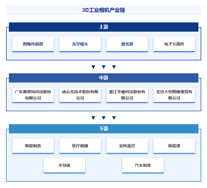 中国3D工业相机行业历经多年发展,已然构建起完备且充满活力的产业链生态。在产业链上游,以核心零部件供应为主,包括光学镜头、图像传感器、激光器以及各类电子元件等关键组件,目前高端部件仍部分依赖进口;中游为3D工业相机的设计、研发与制造,奥普特、华睿科技等本土制造商,在结构光、ToF、双目视觉等技术路线各具优势,正加速实现国产替代;产业链下游,应用场景广泛覆盖智能制造、医疗健康、安防监控、新能源、半导体、汽车制造等重点领域,通过系统集成为终端客户提供智能化检测解决方案。3D工业相机行业产业链如下图所示: