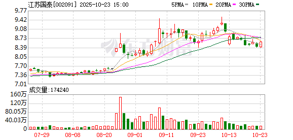 证券时报·数据宝统计显示,江苏国泰今日收盘价为8.59元,上涨2.14%,日换手率为1.09%,成交额为1.48亿元,全天主力资金净流出267.88万元,近5日该股累计下跌1.04%,近5日资金合计净流出5279.75万元。