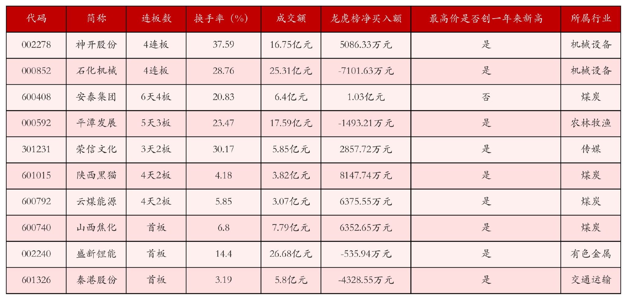 截至10月23日收盘,上证综指上涨0.22%,收于3922.41点,深证成指上涨0.22%,收于13025.45点,创业板指上涨0.09%,收于3062.16点。今日沪深两市A股共计72只涨停,综合当前连板数以及当日龙虎榜数据,其中较为强势的前三只个股分别为:神开股份(002278)、石化机械(000852)与安泰集团(600408)。今日强势个股前10位具体数据见下表:
