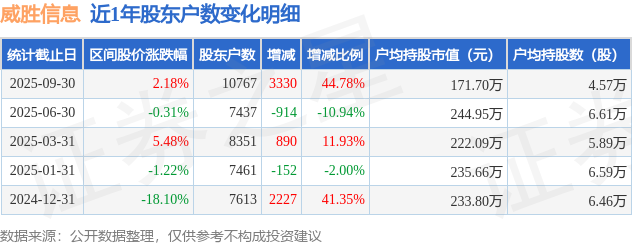 从股价来看,2025年6月30日至2025年9月30日,威胜信息区间涨幅为2.18%,在此期间股东户数增加3330.0户,增幅为44.78%。