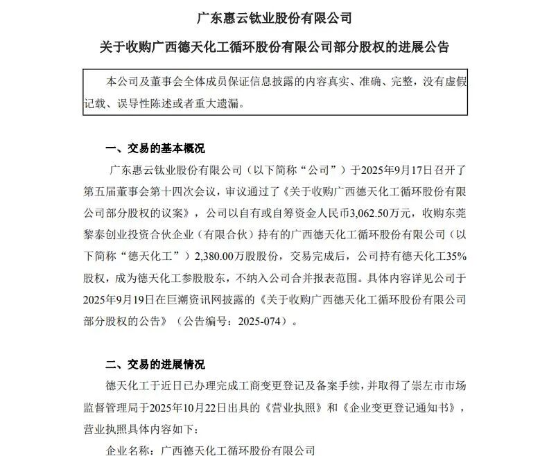 慧正资讯,10月22日,惠云钛业发布公告,宣布以3062.5万元收购德天化工35%股权(2380万股),目前已完成工商变更登记及备案手续,并取得了新的营业执照和企业变更登记通知书。入股德天化工前,惠云钛业以6300万元获得了上游的钛矿企业辰翔矿业70%股权。意味着惠云钛业完成了又一起产业链整合。