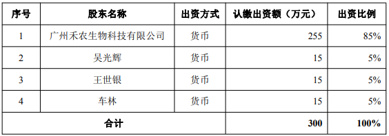 合资公司注册资本为人民币300万元,其中:广州禾农以货币方式出资255万元,占合资公司注册资本的85%;王世银先生、吴光辉先生、车林先生各以货币方式出资15万元,分别占合资公司注册资本的5%。
