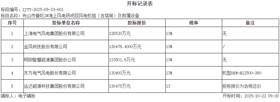 10月22日,舟山市普陀2# 海上风电场项目风电机组(含塔筒)及附属设备开标,共五家整机商参与竞标,分别是: