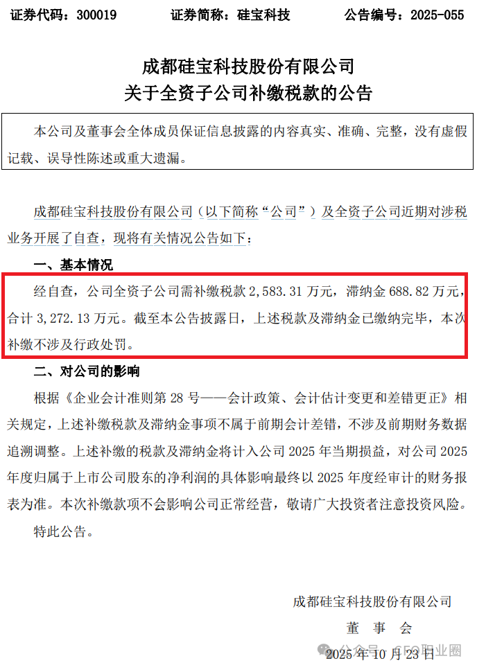 2025年10月23日,深交所创业板上市公司硅宝科技(300019.SZ)发布了《关于全资子公司补缴税款的公告》。公告显示,公司及全资子公司近期对涉税业务开展了自查。