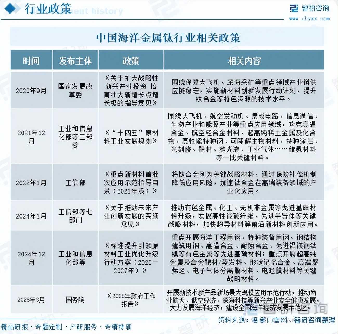注:本文节选出自智研咨询发布的《趋势研判!2025年中国海洋金属钛行业政策、发展现状、细分市场需求情况及未来发展前景分析:“深海科技”赋能,海洋金属钛市场空间持续扩容[图]》行业分析文章,如需获取行业文章全部内容,可进入智研咨询搜索查看。