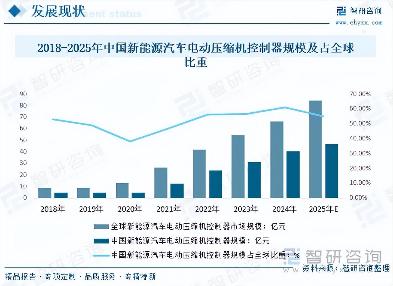 内容概要:随着新能源汽车技术的发展以及基础设施布局的完善,全球新能源汽车及其部件的市场规模呈现出快速增长的趋势。其中,电动压缩机控制器作为新能源汽车热管理系统的核心控制部件之一,其整体市场规模也在不断扩大。中国最为全球最大的新能源汽车产销市场,新能源汽车电动压缩机控制器需求规模近年来占全球比重基本维持在50%以上,2024年全球新能源汽车电动压缩机控制器规模为66.56亿元,中国新能源汽车电动压缩机控制器市场规模攀升40.69亿元,约占全球61.13%。预计2025年,全球新能源汽车电动压缩机控制器规模约为84.8亿元,中国新能源汽车电动压缩机控制器市场规模将达46.83亿元,约占全球55.22%。