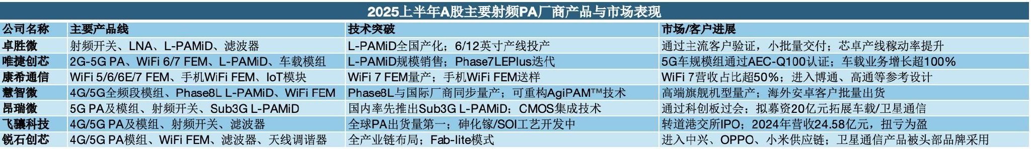 作为国内射频PA龙头,唯捷创芯已构建覆盖2G至5G、WiFi6/6E至WiFi7的全套射频PA产品矩阵。2025年上半年,公司射频PA实现收入7.89亿元,占总营收的80.19%。