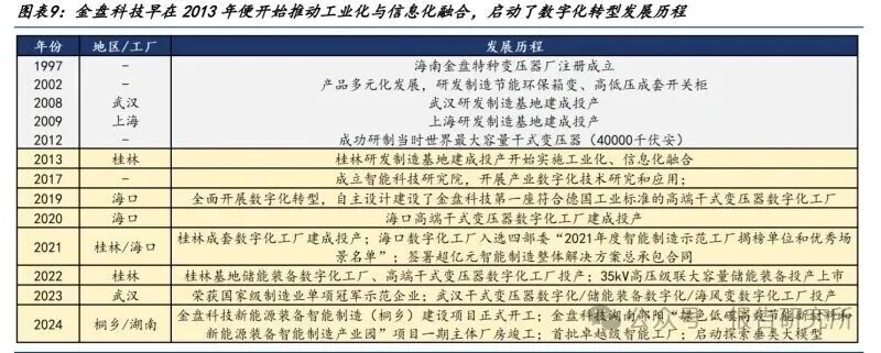 金盘科技早在 2013 年便开始推动数字化转型,先后建设了 7 座变压器/成套/储能数字化 工厂。公司通过将数字孪生等科技与传统的制造工艺深度融合,成功实现了离散型制造业 的全流程数字化转型,大幅度提高了全要素生产效率和产品质量——经过统计,数字化改 革前后对比,24 年公司实际人均产量提升 1.4 倍、人均产值提升 1.8 倍、单位成本下降 23%、库存周转率提升 3 倍。 公司数字化工厂贯穿了从研发到售后的所有业务节点,横向延伸至供应链管理,实现了生 产线、物流配送和信息流自动化,这在以劳动密集型为代表的变压器行业十分稀有(当前 许多变压器工厂的绕线/叠片环节仍需手工)。公司已成功将数字化工厂整体解决方案对外 输出(例如伊戈尔、望变电气),提供可复制、可推广的改造样本,数字化工厂整体解决 方案累计订单超 8 亿元,24 年数字化整体解决方案业务同比增长 74.04%。