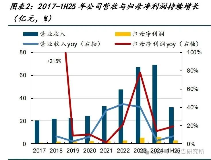 2017-2024 年公司营收和归母净利润年化复合增速分别为 19%和 25%,业绩稳健增长。
