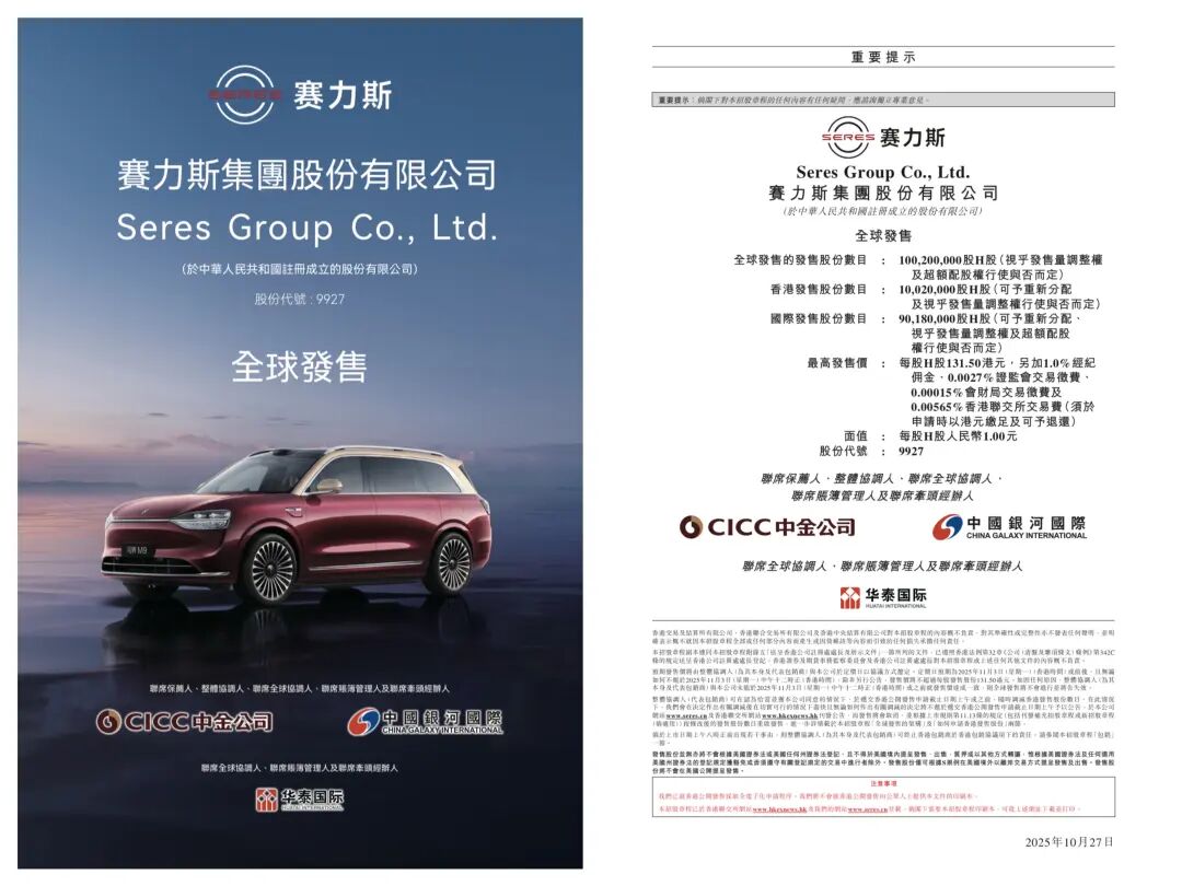 10月27日,赛力斯开启港股招股,招股期持续至10月31日,计划于11月5日正式以“9927”为股票代码在港交所主板挂牌,上市后将成为首家“A+H”两地上市的豪华新能源车企。