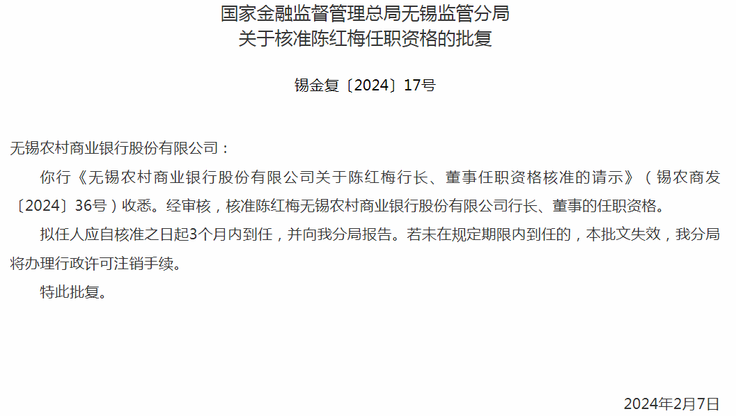 2023年11月,陈红梅接替陶畅出任无锡银行行长,次年2月任职资格获批。