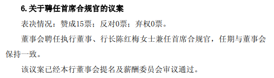 无锡银行近日发布公告,10月24日召开了第七届董事会第六次会议。会议通过相关议案,董事会聘任执行董事、行长陈红梅兼任首席合规官,任期与董事会保持一致。