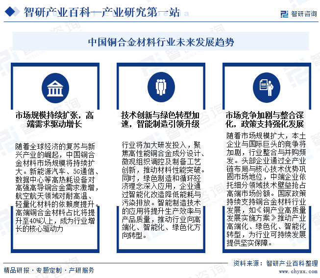 目前,中国铜合金材料行业正迈向高端化、绿色化与智能化协同发展的新阶段,在新能源汽车、5G通信、航空航天等新兴产业需求驱动下,市场规模将持续扩张,高性能铜合金材料占比稳步提升;同时,企业通过技术创新突破成分设计与制备工艺瓶颈,并加速智能制造改造以降本增效,环保法规倒逼绿色制造体系完善,推动行业向低碳循环模式转型,政策与资本双重加持下,产业整合与全球化布局将进一步深化。