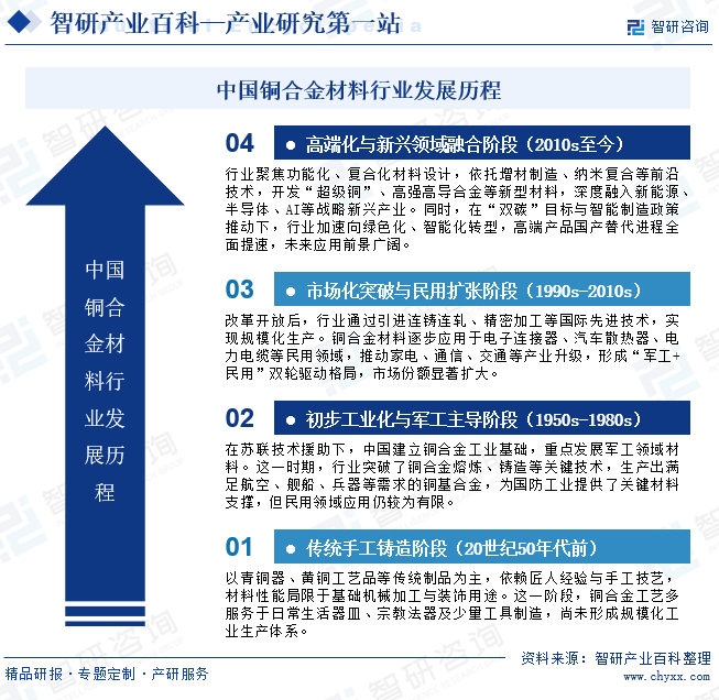 中国铜合金材料行业的发展历程经历了从传统手工铸造到现代高端制造的跨越式演进:早期以青铜器、黄铜工艺品为典型代表(20世纪50年代前),工艺多依赖匠人经验;1950年至1980年,在苏联技术援助下,行业逐步构建起初步工业体系,聚焦军工领域需求,攻克了一批关键材料技术;1990年至2010年,改革开放的浪潮推动行业通过引进连铸连轧等先进技术,突破市场化瓶颈,在电子、汽车等民用领域实现规模化应用;2010年至今,行业迈入现代高端铜合金发展阶段,材料设计向功能化、复合化深度演进,依托增材制造、纳米复合等前沿技术,成功研发“超级铜”等新型材料,并深度融入新能源、半导体、AI等新兴产业生态。与此同时,在“双碳”目标与智能制造战略的双重驱动下,行业加速向绿色化、智能化转型,高端产品国产替代进程全面提速。未来,随着新能源、半导体等新兴领域的崛起,铜合金材料将迎来更广阔的应用空间。