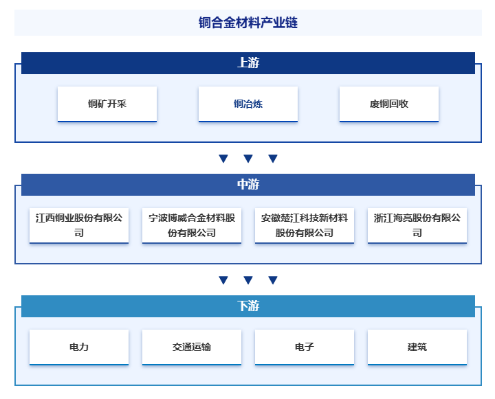 中国铜合金材料行业产业链呈现“上游资源依赖、中游技术驱动、下游需求牵引”的特征。铜合金材料产业链上游以铜矿开采、冶炼和废铜回收为核心,受限于国内资源禀赋,高度依赖进口铜精矿(对外依存度超70%),同时再生铜利用比例持续提升;中游为铜合金加工制造环节,企业通过熔炼、轧制、拉拔等工艺生产铜棒、铜板、铜线等多样化产品,技术壁垒呈现“低端过剩、高端短缺”的分化格局,部分企业已在高强高导铜合金、超细铜丝等高端领域实现国产替代突破;下游应用场景广泛覆盖电力、交通运输、电子、建筑、航空航天等领域,其中新能源汽车(高压连接器、电池极耳)、5G通信(散热基板、高频线路)等新兴产业成为需求增长引擎,推动行业向功能化、复合化方向升级。铜合金材料行业产业链如下图所示: