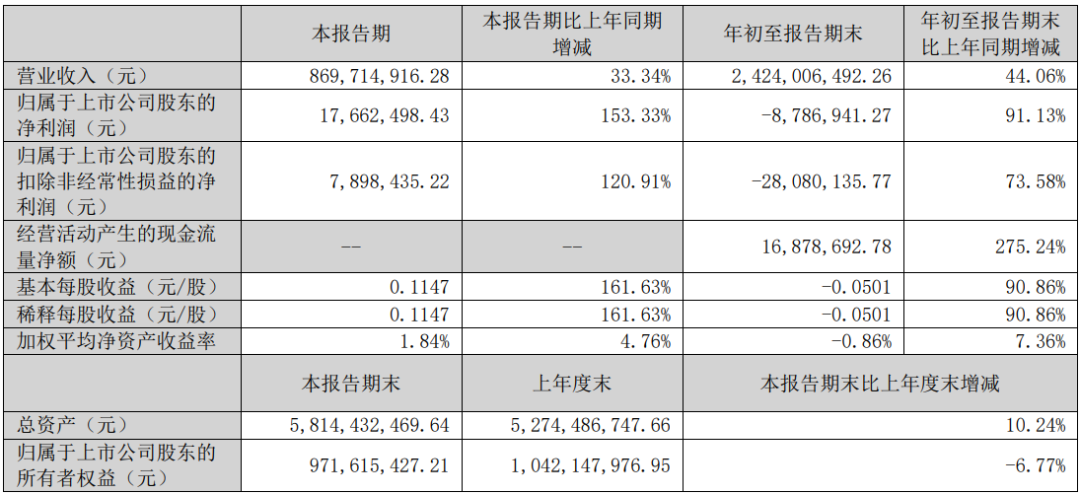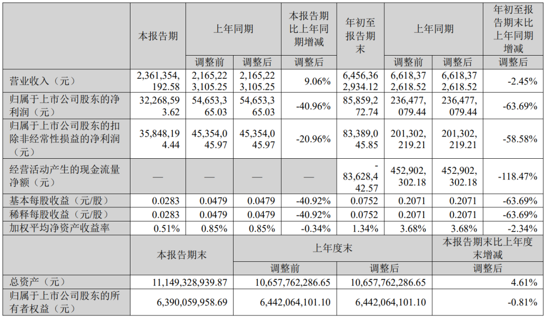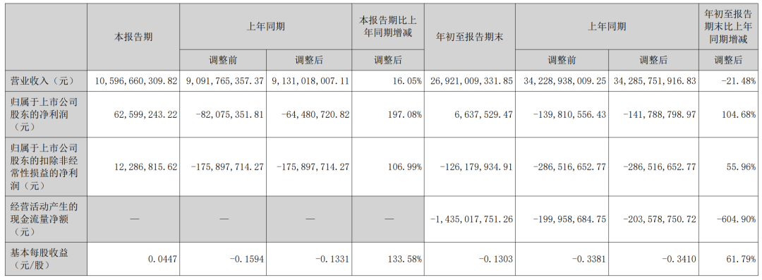 其中第三季度营业收入为105.97亿元,同比提升16.05%;归母净利润6259.92万元,同比提升197.08%;扣非净利润1228.68万元,同提升106.99%。
