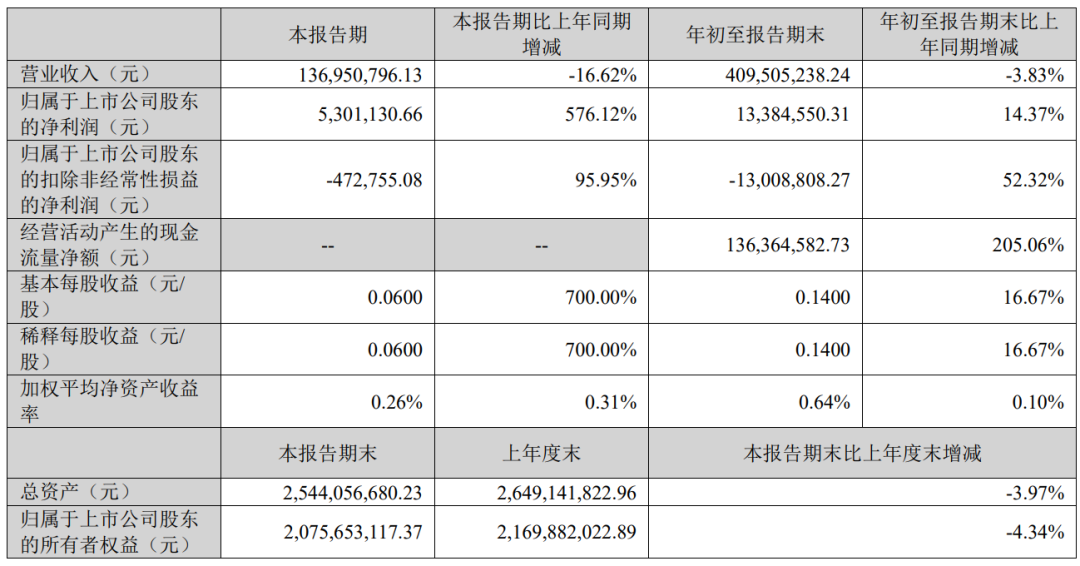 其中第三季度实现营收1.40亿元,同比下降18.42%;归母净利润2040.58万元,同比上涨504.25%;扣非净利润1314.20万元,同比增长466.52%。