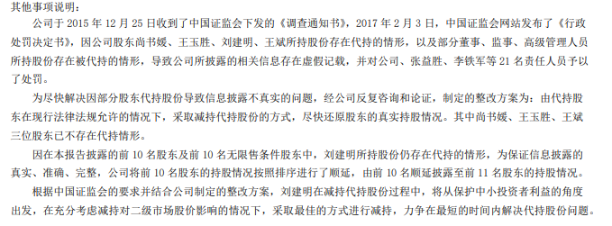 为尽快解决因部分股东代持股份导致信息披露不真实的问题,经公司反复咨询和论证,制定的整改方案为:由代持股东在现行法律法规允许的情况下,采取减持代持股份的方式,尽快还原股东的真实持股情况。其中尚书媛、王玉胜、王斌三位股东已不存在代持情形。