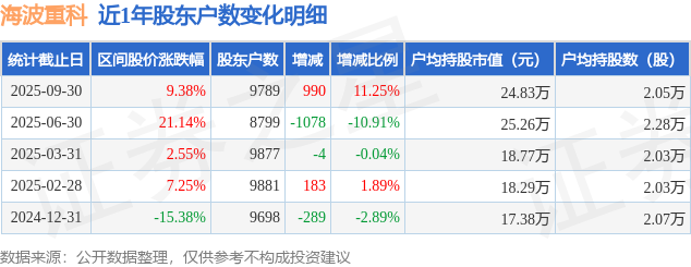 从股价来看,2025年6月30日至2025年9月30日,海波重科区间涨幅为9.38%,在此期间股东户数增加990.0户,增幅为11.25%。