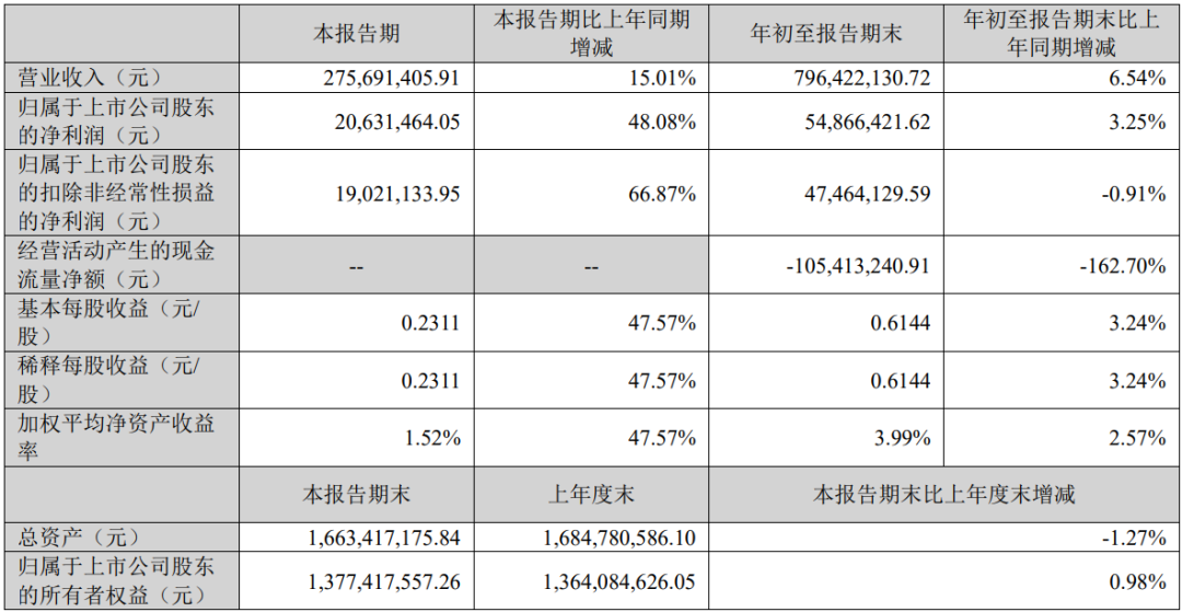 今年前三季度,公司累计实现营业收入7.96亿元,同比增长6.54%;归属于上市公司股东的净利润5486.64万元,同比增长3.25%。值得关注的是,公司第三季度扣除非经常性损益的净利润同比增长66.87%,反映出主营业务盈利能力的显著提升。