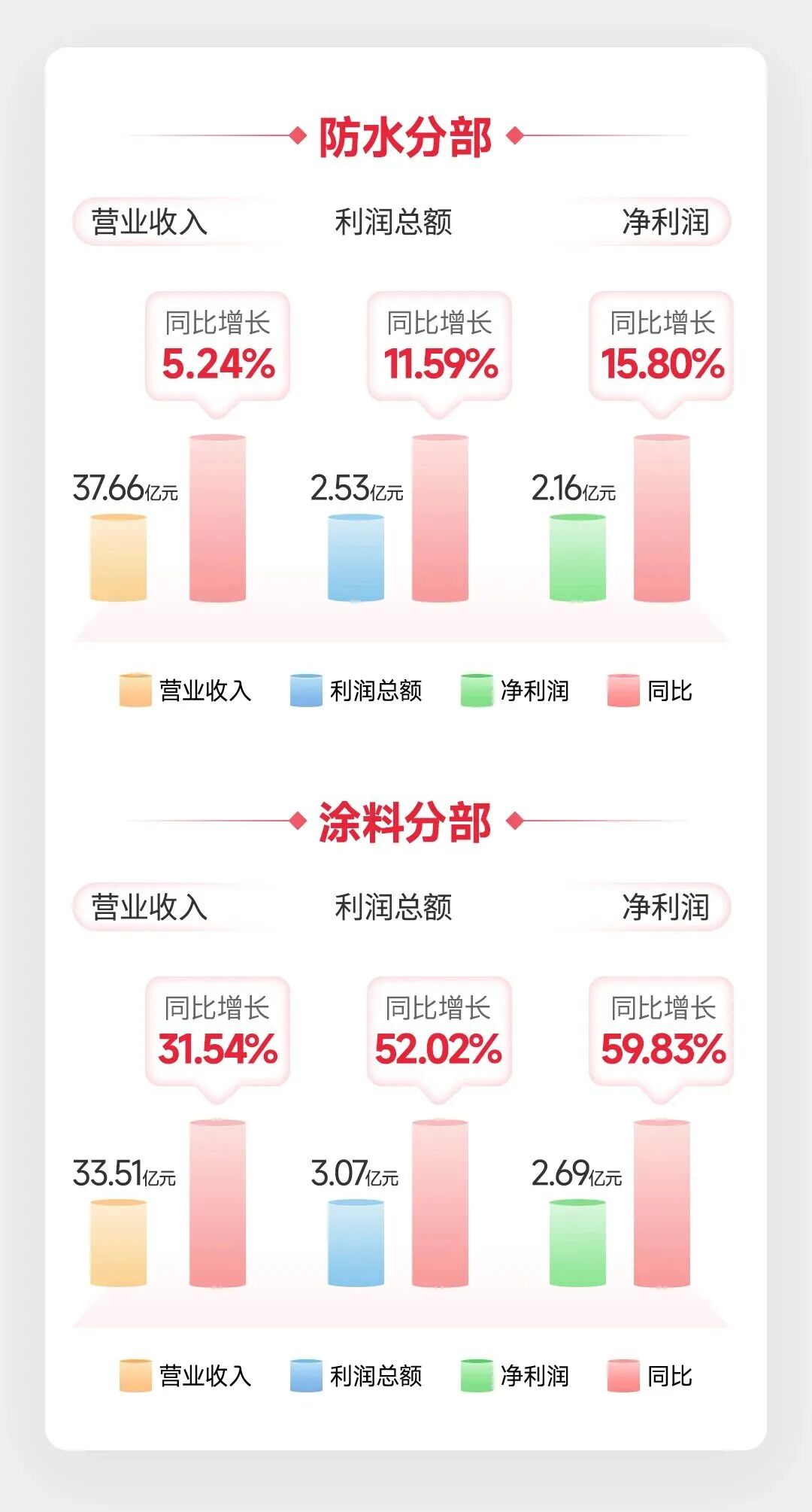 根据《英才商业》报道,2025年前三季度,北新建材防水业务实现营业收入37.66亿元,同比增长5.24%;利润总额2.53亿元,同比增长11.59%;净利润2.16亿元,同比增长15.80%。涂料业务营业收入33.51亿元,同比增长31.54%;利润总额3.07亿元,同比增长52.02%;净利润2.69亿元,同比增长59.83%。