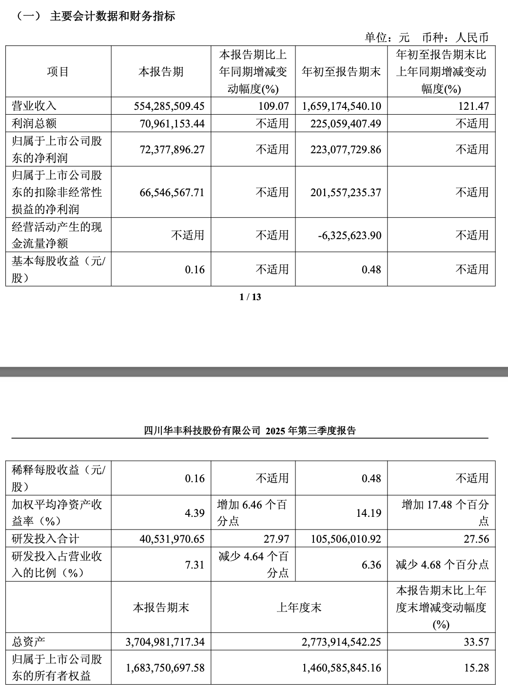 2025年Q3,华丰科技营收为5.54亿元,同比增长109.07%;归母净利润为7237.79万元,同比增长335.56%,扭亏为盈。