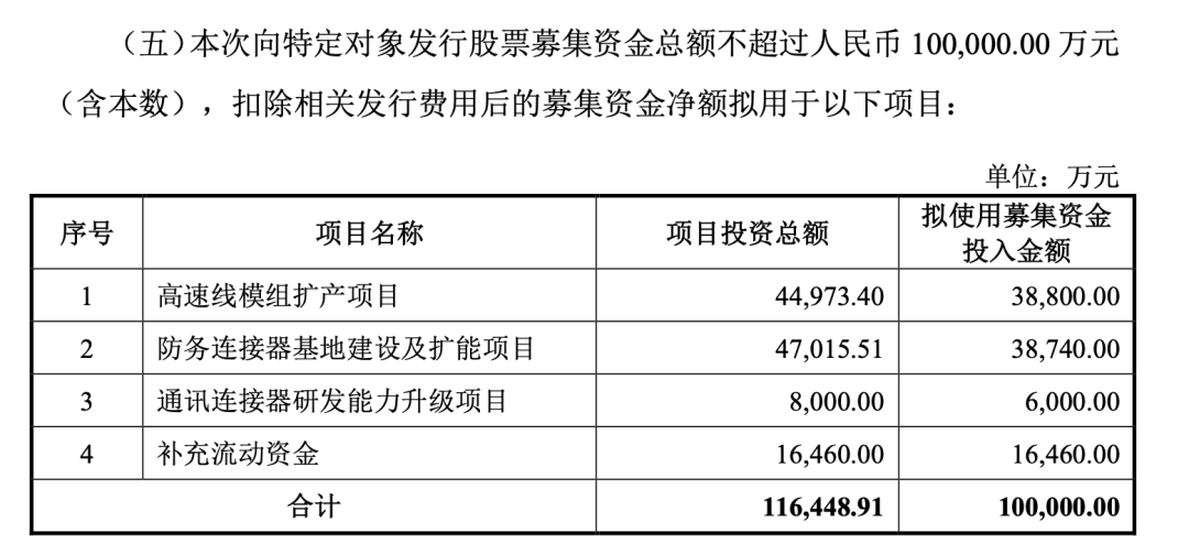 值得一提的是,就在10月16日,华丰科技定增再融资项目获上交所受理。方案显示,华丰科技拟向不超过35名特定投资者发行不超过3000万股,募资10亿元用于高速线模组扩产项目、防务连接器基地建设及扩能项目、通讯连接器研发能力升级项目、补充流动资金四大项目。
