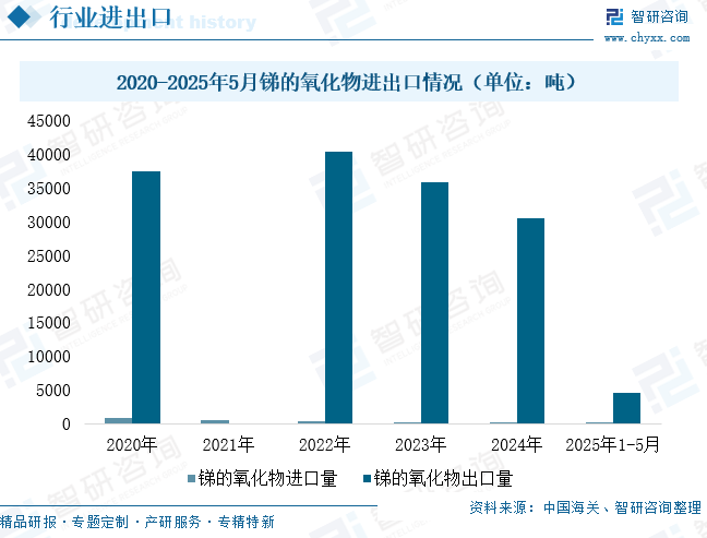我国锑氧化物贸易格局在2022年后进入深度调整期,进出口规模呈现系统性收缩。受2024年出口管制政策影响,锑氧化物贸易量加速下滑:2024年全年进口量降至192.1吨,较2022年基准萎缩38.23%;出口量收窄至30420.72吨,同比减少24.47%。这一下行趋势在2025年进一步强化,1-5月进口量仅22.64吨,同比骤降72.96%;出口量4563.6吨,同比暴跌67.56%。