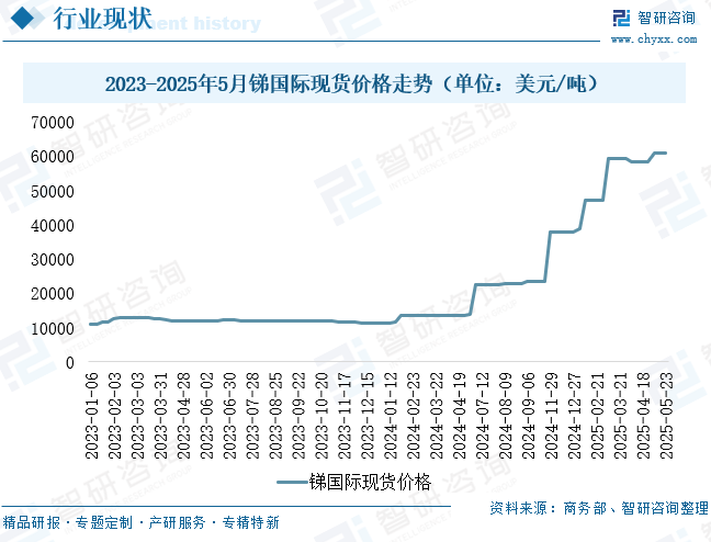 2024年以来,全球锑市场呈现爆发式上涨行情,价格屡创历史新高。从国际现货市场来看,锑价从年初的1.13万美元/吨飙升至年末的3.8万美元/吨,年度涨幅高达234.8%,创下近十年来最大年度涨幅。进入2025年,这一上涨趋势持续强化,截至5月底国际现货价格已突破6万美元大关,达到6.1美元/吨,较2024年底再涨60.5%。国内市场同样表现强劲,2025年1-5月锑精矿均价达17.28万元/吨,同比暴涨113.3%;锑锭价格维持在19.45万元/吨的高位。这一轮价格暴涨主要受供需失衡驱动:一方面,国内环保限产和资源枯竭导致供应持续收紧;另一方面,光伏玻璃等新能源领域需求呈现爆发式增长,共同推高了市场价格。