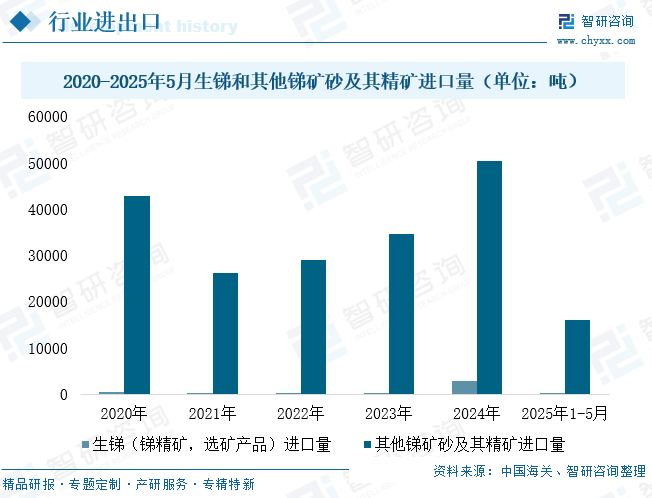 从我国锑矿贸易格局来看,进口依赖程度持续加深,呈现明显的资源净输入特征。2021年至今,锑矿进口规模总体保持扩张态势,但品类结构和年度波动显著。根据海关最新统计,2024年生锑(锑精矿及选矿产品)进口量达2719.09吨,实现同比1043.49%的爆发式增长;同期其他锑矿砂及其精矿进口量突破5万吨大关,录得50230.69吨,同比增长45.68%。进入2025年,进口格局发生结构性调整:1-5月生锑进口量骤降至55.38吨,同比萎缩97.09%;其他锑矿砂进口量21292.8吨,同比回落24.67%。