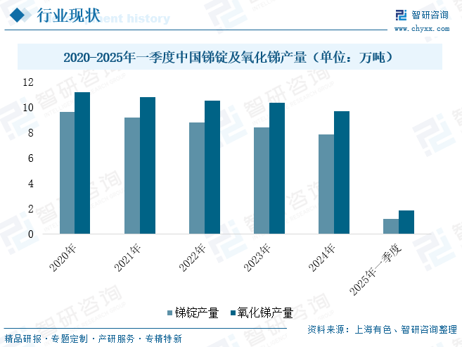 中国锑冶炼行业正处于深度结构性调整阶段,产能格局发生显著重构。在日趋严格的环保监管和资源约束双重压力下,2024年行业整体开工率已降至30-40%的历史低位,全国33家主要锑冶炼企业中近六成(19家)陷入停产状态,剩余企业也普遍面临原料供应不足的运营困境。行业主要产品方面,近年来受多重因素影响,锑锭和氧化锑产量呈现持续下滑态势。数据显示,2024年全国锑锭产量7.88万吨,同比下滑8.09%;氧化锑产量9.67万吨,同比下降6.50%。进入2025年,这一下行趋势进一步加剧。一季度锑锭产量仅1.18万吨,同比骤降27.04%,主要受环保限产加码和缅甸进口矿源减少影响;同期氧化锑产量1.83万吨,同比下降18.93%,与下游光伏玻璃行业需求放缓形成明显联动效应,凸显产业链供需结构性矛盾。