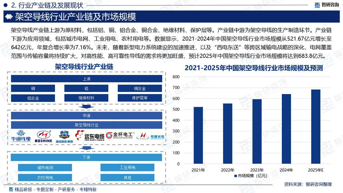 架空导线,就是架设在地面以上,用于传输电能的导线。它通常由导电性能良好的金属制成,如铝、铜及其合金,外层则覆盖有绝缘材料和保护层,以防止电流泄漏和外界环境的侵蚀。架空导线的结构主要包括导体、绝缘层、护套和附属设施等部分。架空导线根据用途和结构的不同,可分为多种类型,常见的架空导线主要包括低压架空导线、高压架空导线和特种架空导线。近年来,伴随经济持续增长与工业化、城镇化进程加速,工业生产和居民用电需求快速攀升,远距离、大容量电能输送成为刚性需求,为架空导线行业奠定了坚实的发展基础。与此同时,国家积极推动能源结构转型与电网系统升级,特高压骨干网架建设、新能源规模化并网消纳以及城乡配电网改造等重大工程的持续推进,进一步直接拉动了对高导电、高强度、耐腐蚀等各类架空导线的市场需求。数据显示,2021-2024年中国架空导线行业市场规模从521.67亿元增长至642亿元,年复合增长率为7.16%。未来,随着新型电力系统建设的加速推进,以及“西电东送”等跨区域输电战略的深化,电网覆盖范围与传输容量将持续扩大,对高性能、高可靠性导线的需求将更加旺盛,预计2025年中国架空导线行业市场规模将达到683.8亿元。中国架空导线行业已形成充分竞争的多元化市场格局,众多企业凭借各自优势参与其中。全国性领先企业在技术研发、品牌影响力及高端产品市场占据重要地位,区域性企业则在特定细分领域保持稳定竞争力。随着新型电力系统建设的深入推进,行业竞争焦点正从价格因素逐步转向技术实力、产品质量与综合服务能力的全方位比拼,市场份额呈现出向具备核心竞争优势企业集中的发展趋势。当前,中国架空导线行业代表企业主要包括河北华通线缆集团股份有限公司、广东新亚光电缆股份有限公司、金杯电工股份有限公司、江苏亨通光电股份有限公司、河南通达电缆股份有限公司、浙江晨光电缆股份有限公司、湖南华菱线缆股份有限公司、中天科技海缆股份有限公司、航天电工集团有限公司、中邦线缆集团有限公司、远东电缆有限公司、固达电线电缆(集团)有限公司等。