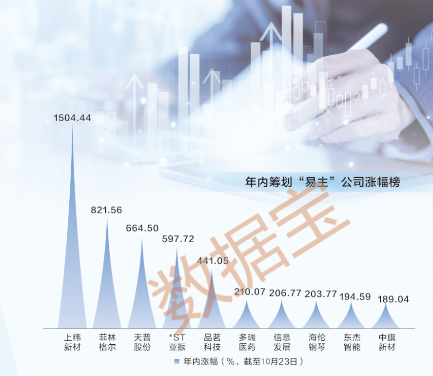基于对资产运作的预期,上市公司控制权交易,往往伴随着股价大涨。据数据宝统计,截至10月23日,年内有筹划控制权交易的上市公司中,有22家年内股价已翻番。A股年内股价涨幅前十的公司中,有5家涉及控制权交易,包括上纬新材、菲林格尔、*ST亚振、天普股份、品茗科技。