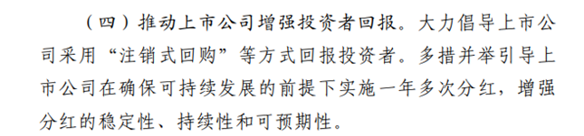 10月27日,证监会公布《关于加强资本市场中小投资者保护的若干意见》,推动上市公司增强投资者回报。大力倡导上市公司采用“注销式回购”等方式回报投资者。多措并举引导上市公司在确保可持续发展的前提下实施一年多次分红,增强分红的稳定性、持续性和可预期性。