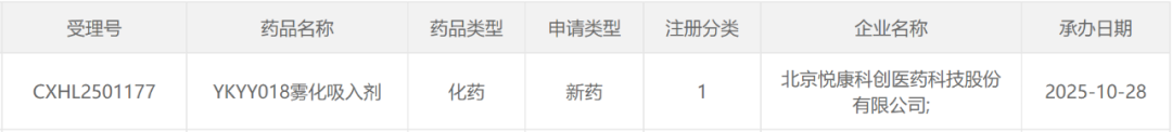 YKYY018雾化吸入剂是一款化药1类创新药,其临床申请于10月28日获批CDE承办受理,目前悦康药业在国内尚无吸入剂产品获批。