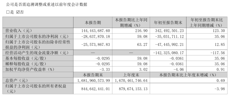 其中第三季度,公司营业收入为1.44亿元,同比上升216.9%;归母净利润自去年同期亏损6998万元变为亏损2864万元,亏损额有所减少;扣非归母净利润自去年同期亏损6962万元变为亏损2557万元,亏损额有所减少;EPS为-0.0292元。