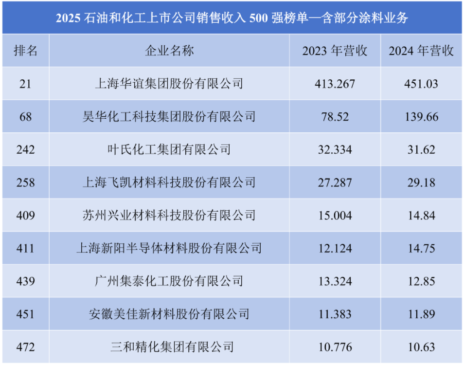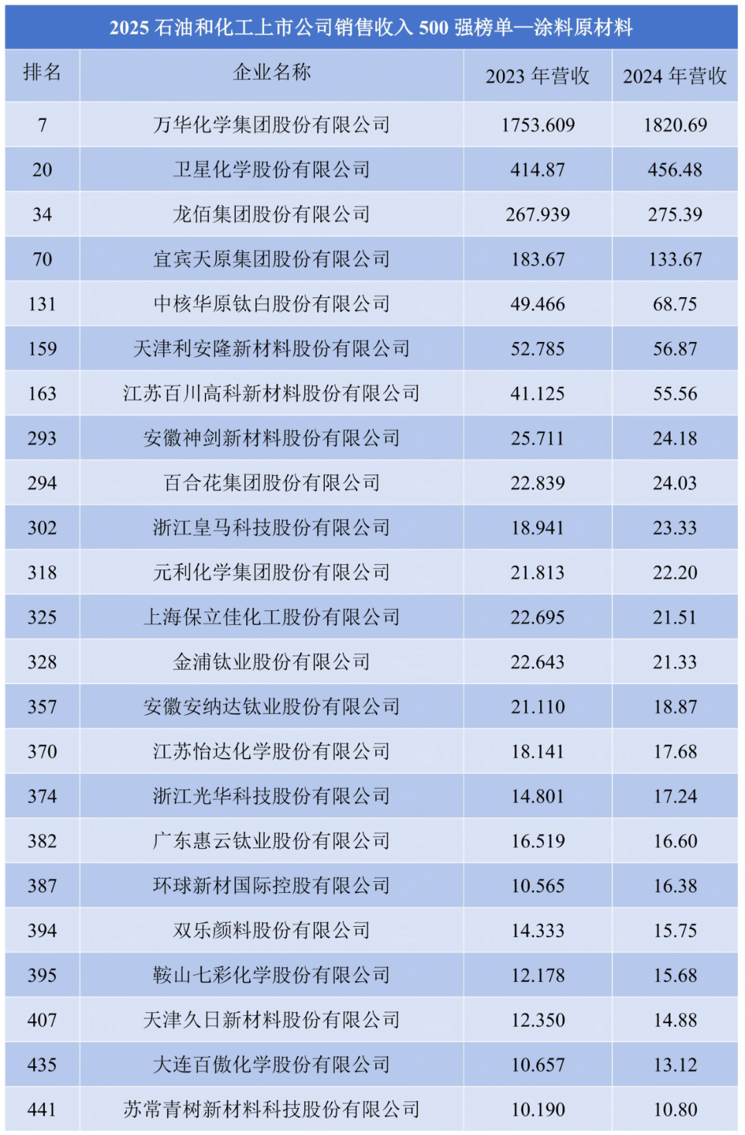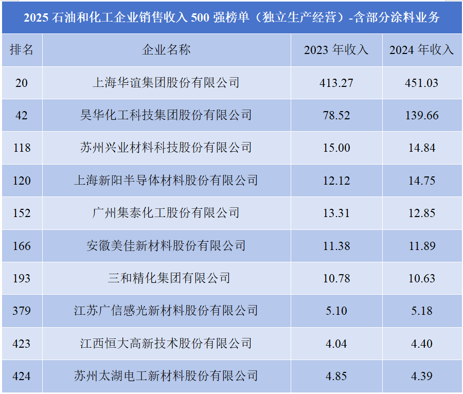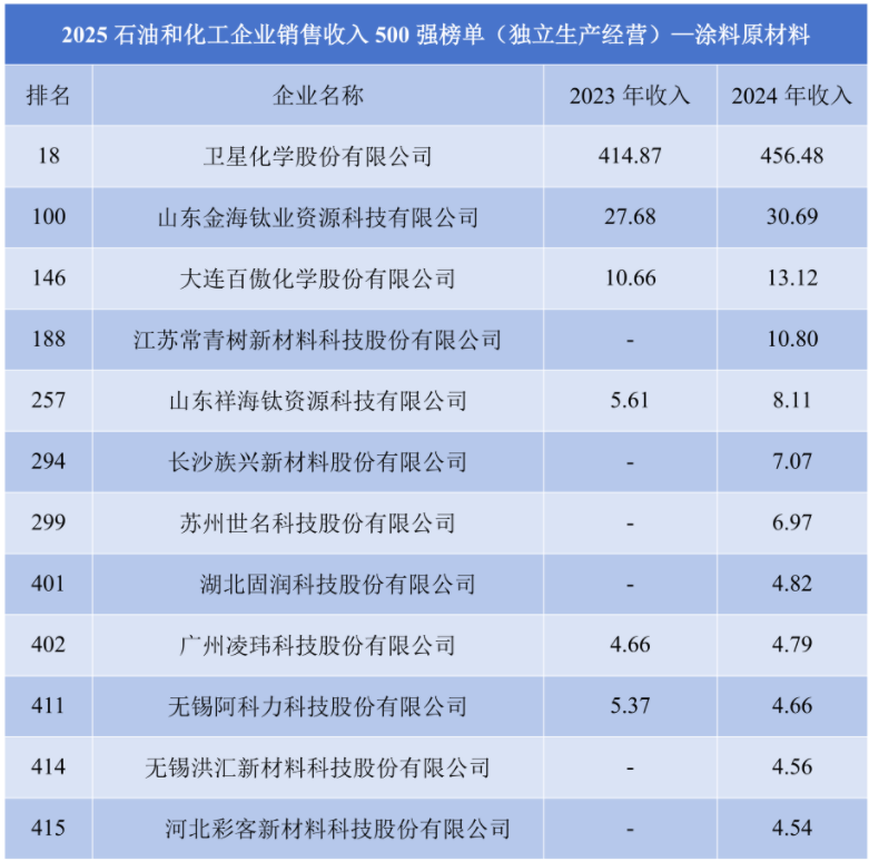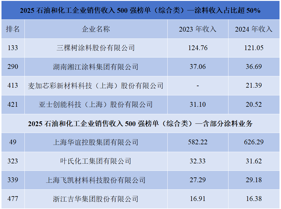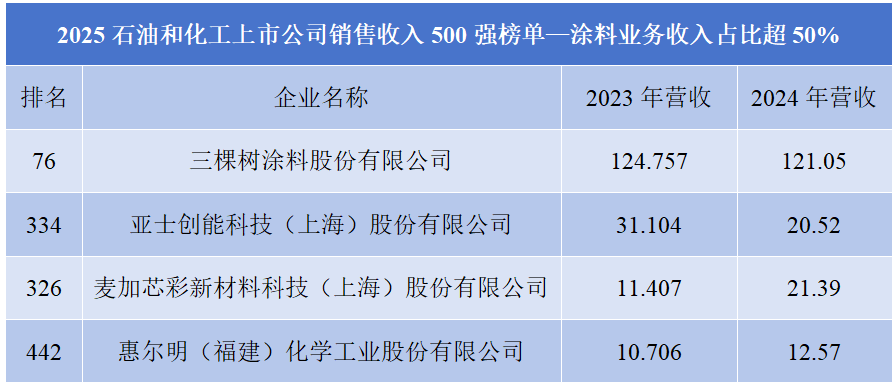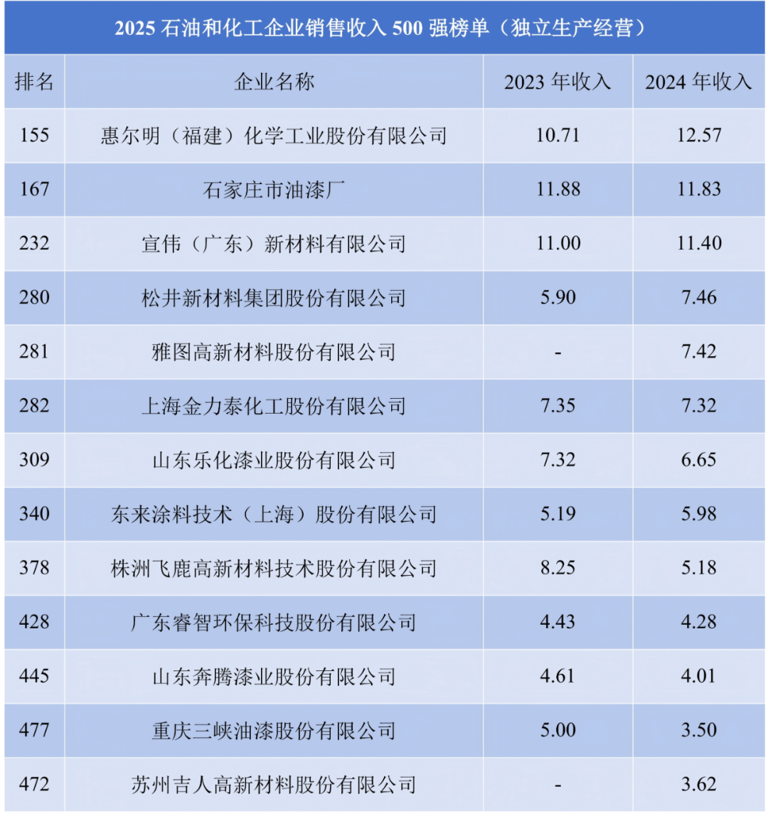 作为行业发展的风向标,三大榜单中涂料企业的身影尤为亮眼,重点企业排名与营收数据精准呈现如下: