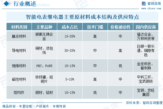 智能电表继电器上游原材料成本以导电材料(铜材等,占比30-35%)和触点材料(银氧化锡合金,占比15-20%)为主,二者技术门槛与价格波动性较高,分别依赖白银一致长通、福达合金等具备专利或资源优势的供应商;绝缘材料(PBT等,占比10-15%)和结构件(钢材等,占比10-15%)成本占比稳定,供应由金发科技、宝钢等企业通过技术改性或规模化生产保障;磁性材料(钕铁硼等,占比5-10%)因性能要求高,由中科三环等企业主导供应。整体呈现“技术材料集中化、大宗材料多元化”的供应格局,企业需通过国产化替代与长协定价应对成本波动。