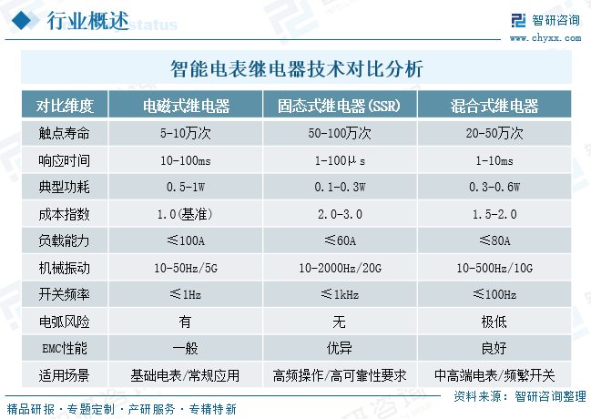 智能电表继电器根据工作原理可分为电磁式、固态式和混合式三种主要类型,其技术参数差异显著:电磁式成本最低(基准1.0)但寿命较短(5-10万次)且响应较慢(10-100ms),适用于基础应用;固态式性能最优(寿命50-100万次、响应1-100μs)但成本最高(2.0-3.0),适合高可靠性场景;混合式在寿命(20-50万次)、响应速度(1-10ms)和成本(1.5-2.0)方面取得平衡,成为中高端市场的理想选择。功耗方面,固态式(0.1-0.3W)明显优于电磁式(0.5-1W),体现了不同技术路线的核心特点和应用定位。