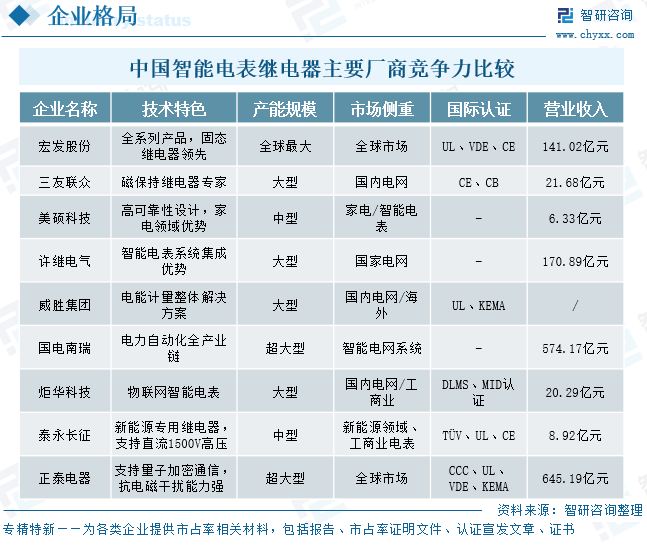 中国智能电表继电器行业呈现“技术引领、规模分野、生态制胜”的竞争格局。头部企业如宏发股份、国电南瑞凭借全产业链技术壁垒(如固态继电器、量子加密通信)与超大规模产能主导高端市场,并通过绑定国网/南网及海外工商业客户构建生态闭环;中型企业如三友联众、炬华科技聚焦细分场景(充电桩、物联网电表),以成本优势或协议兼容性(DLMS/COSEM)切入差异化赛道,同时通过CE/UL认证加速出海;新兴势力如泰永长征、正泰电器则押注新能源赛道(光伏/储能继电器),以高压直流、安全芯片等自研技术突破外资垄断,并依托全球化产能布局(印度、德国工厂)抢占增量市场,整体形成“技术-成本-场景-生态”多维竞争态势。