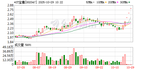 *ST宝鹰盘中涨停,已连收3个涨停板,截至9:27,该股报2.79元,换手率0.01%,成交量9.71万股,成交金额27.09万元,涨停板封单金额为1.65亿元。连续涨停期间,该股累计上涨15.77%,累计换手率为0.19%。最新A股总市值达42.30亿元,A股流通市值42.30亿元。