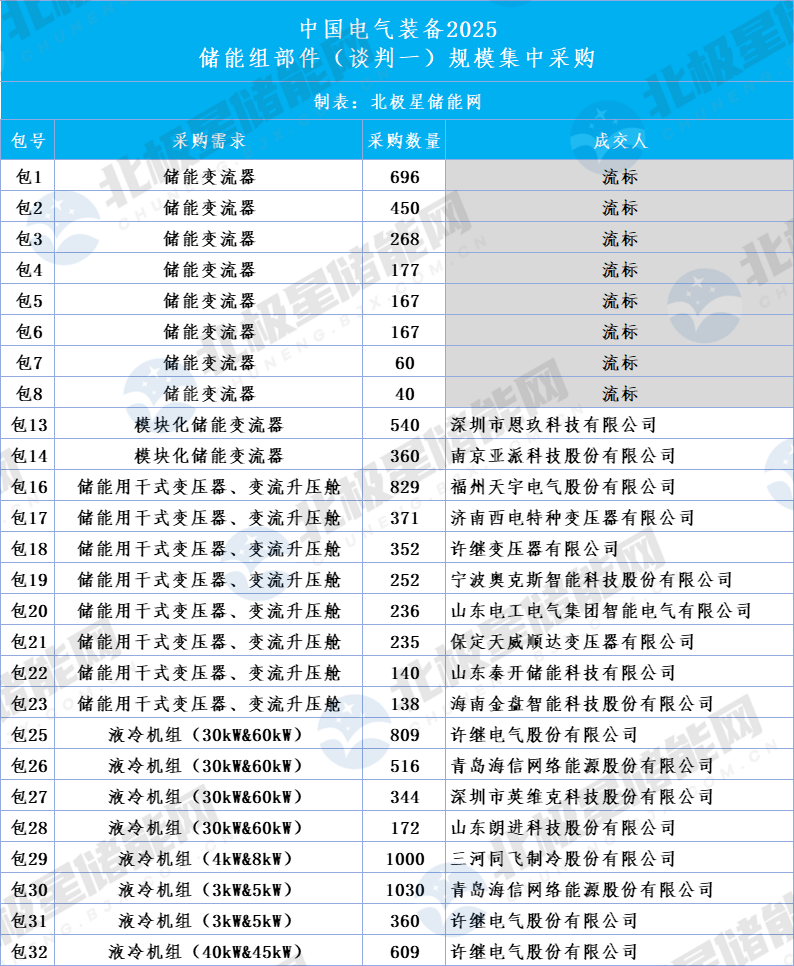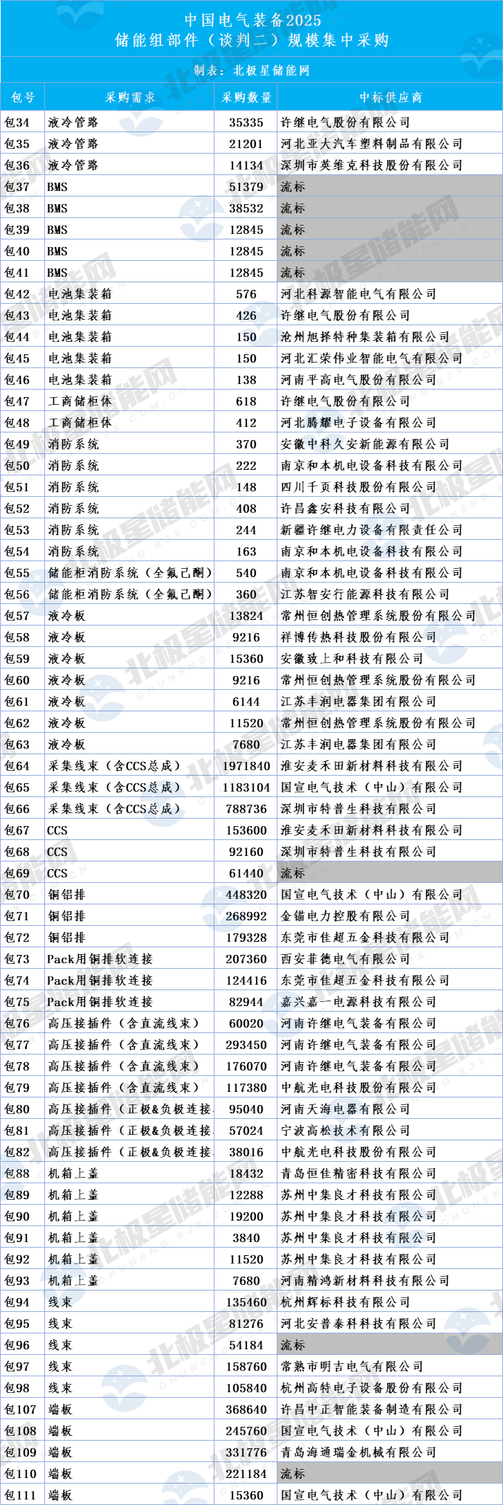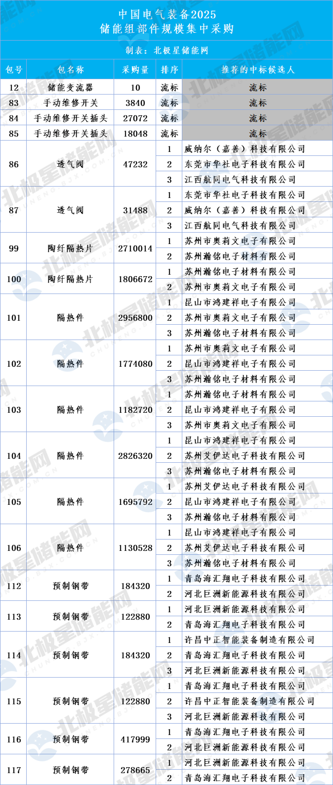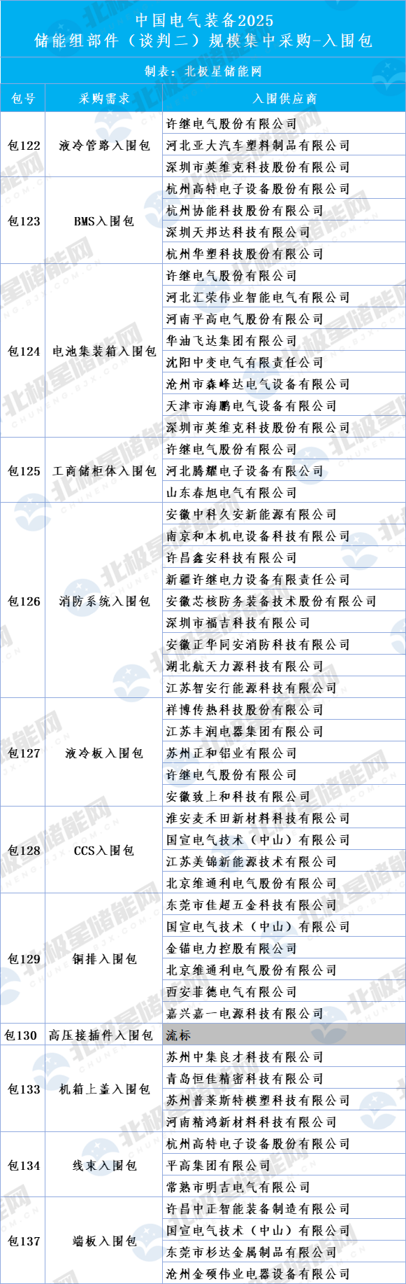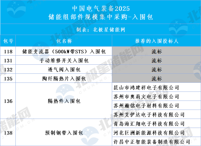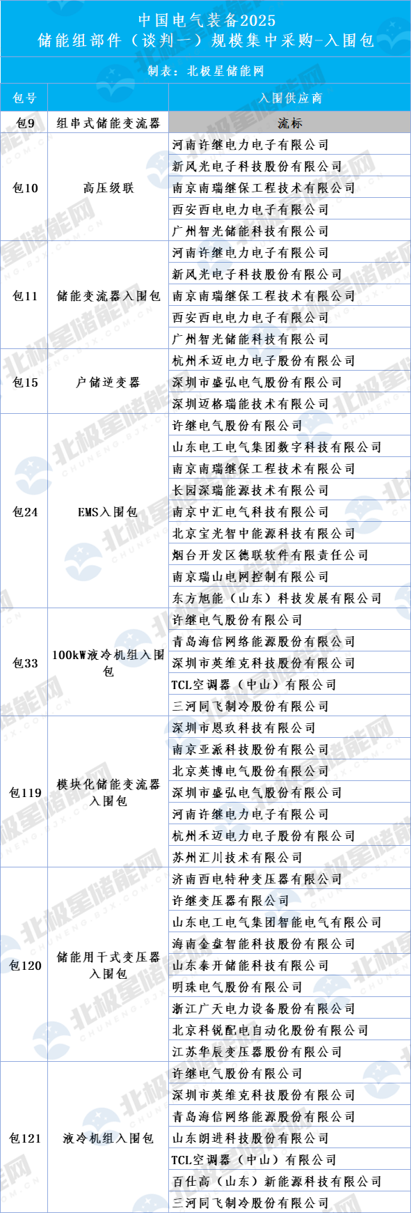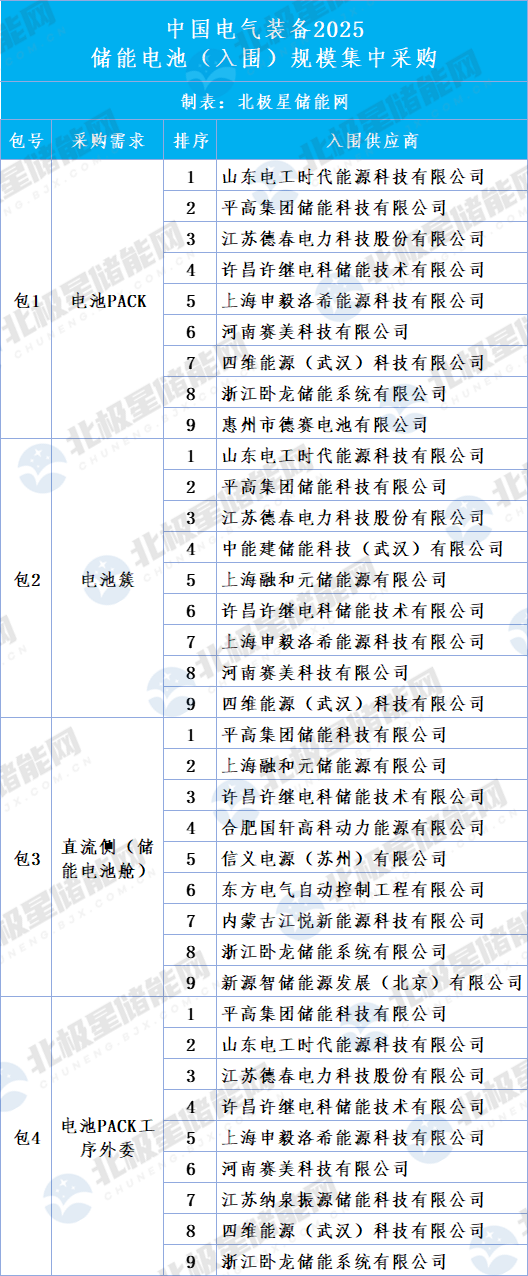 以下为中国电气装备2025年度储能集采的入围供应商全名单,以及各标包的招标内容采购数量和中标候选人名单。