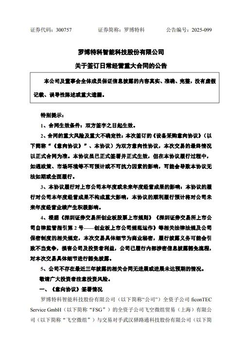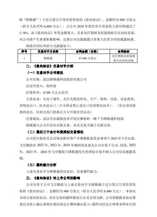 公司全资子公司ficonTECServiceGmbH(以下简称“FSG”)的全资子公司飞空微组贸易(上海)有限公司(简称“飞空微组”)与交易对手武汉驿路通科技股份有限公司(以下简称“驿路通”)于近日签订日常经营性质的《意向协议》,金额约为900万美元(折合人民币约6,400万元),占公司2024年度经审计营业收入的比例超过了5.74%,该《意向协议》单笔金额重大,且系光纤预制及组装线相关自动化设备,对公司将产生重要积极影响,达到公司自愿披露日常重大经营合同的披露标准。