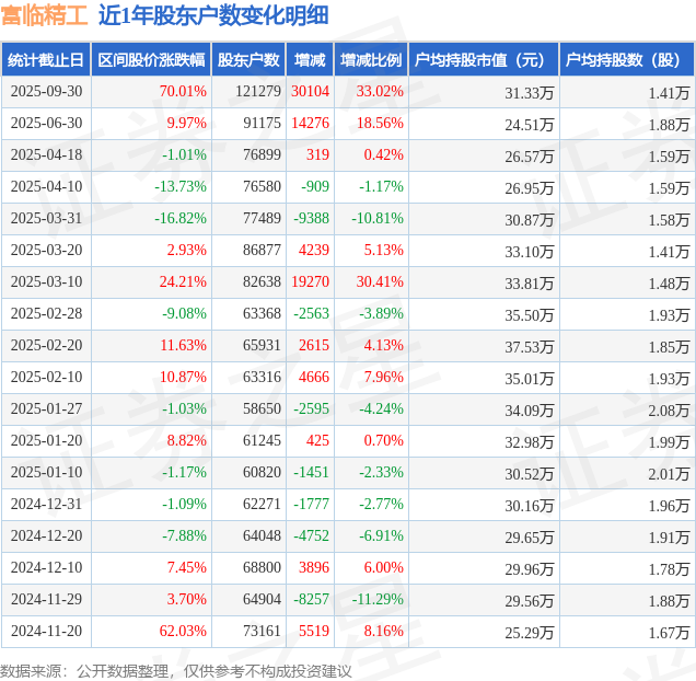 从股价来看,2025年6月30日至2025年9月30日,富临精工区间涨幅为70.01%,在此期间股东户数增加3.01万户,增幅为33.02%。