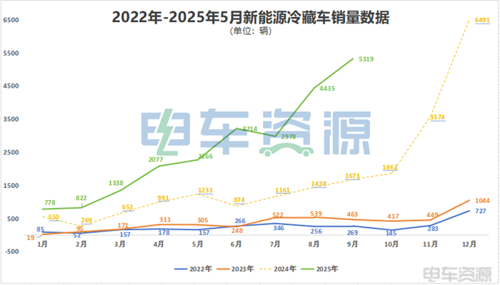 事实上,这种转向并非空穴来风,而是基于市场的真实爆发。行业数据显示,新能源冷藏车销量从2022年的年销三千台,猛增至2024年的月销峰值近6500台;进入2025年,增长势头更为迅猛,9月单月销量已突破5300辆,前9个月累计销量突破2.3万辆更是远超去年全年。这一持续高增的数据轨迹,为经销商们押注冷藏车赛道提供了最有力的信心支撑。